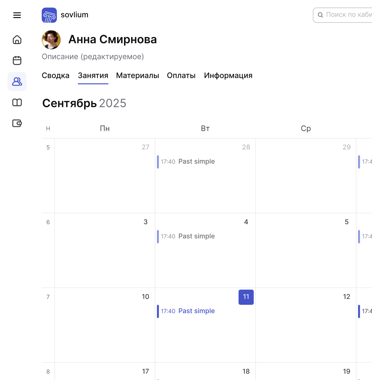 Легко переходите в карточку занятия, где хранятся все материалы и настройки. Остаётся только нажать «Начать»